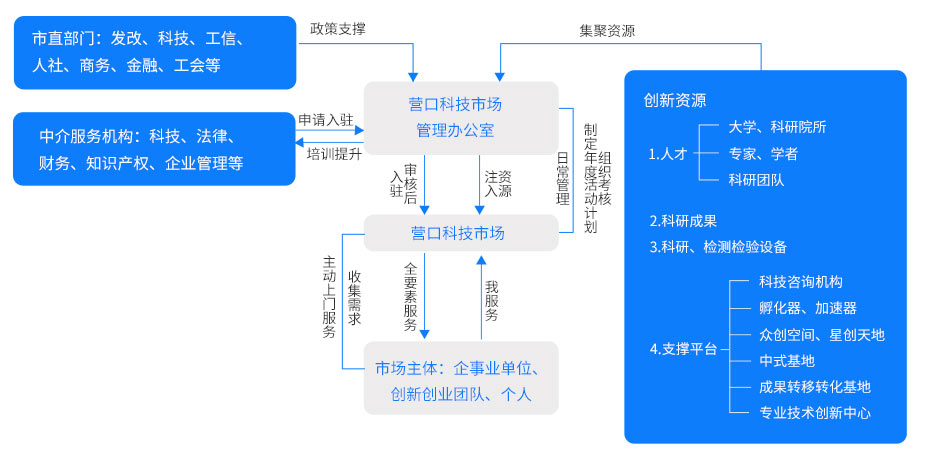 營口科技市場是根據營口市委、市政府的總體部署,由營口市科技局建設,匯聚科技資源和各類市場要素的綜合服務平臺,是我市實施創(chuàng)新發(fā)展戰(zhàn)略,加快國家創(chuàng)新型城市建設的一項重要舉措。